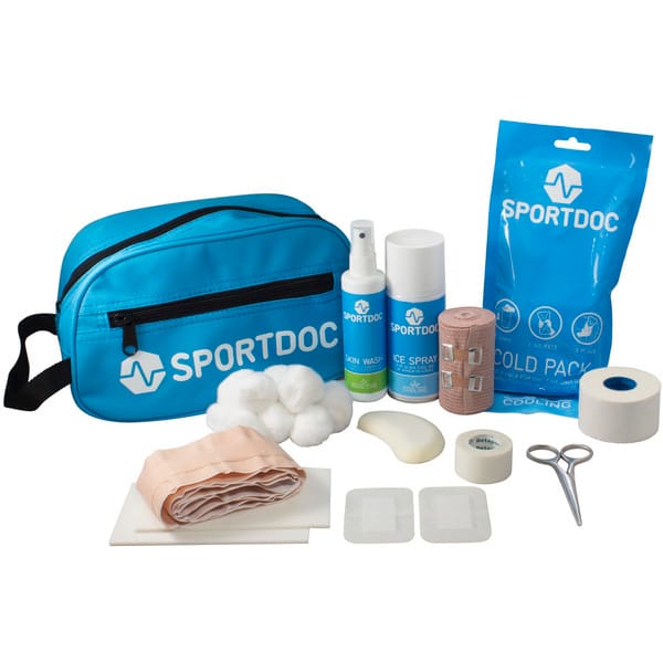 Liten behändig väska packad med det mest nödvändiga. Praktisk att bära med överallt. Medical Blue 1 st Super Elastic bandage 1 st Kompressionskudde 1 st Kylpåse 1 st Kylspray 1 st Skavsårsplatta 2 st Plåster 1 st Kirurgtejp 1 st Bomull 1 st Sårtvätt 1 st Bandagesax 1 st Sjukvårdsväska Mini 1 st